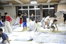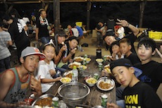 カレー作り終了後、今回キャンプをサポートして頂いた下着メーカー「FREE GUN」のボクサーパンツが子ども達にプレゼントされた。そして入浴を行い、1日目の締めくくりはキャンプファイヤー。